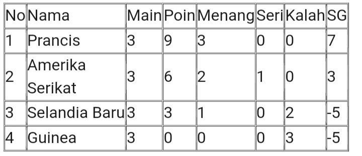 Prancis, yang sudah lebih dulu memastikan lolos ke fase gugur, bermain tanpa beban di laga ini. Sedangkan Selandia Baru harus menang atau imbang agar bisa lolos dengan catatan Amerika Serikat kalah.