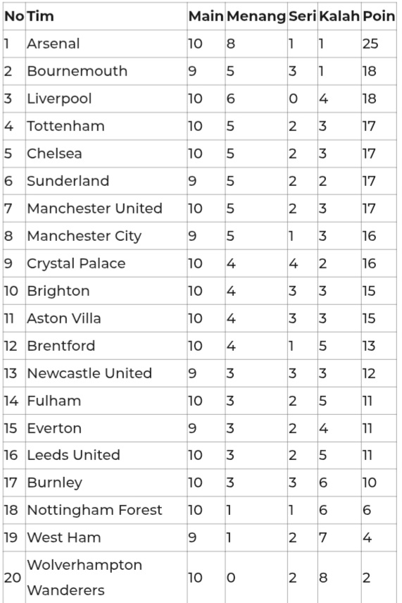 Kemenangan ini membawa Arsenal mengoleksi 25 poin dari 10 pertandingan. Mereka unggul tujuh poin atas Bournemouth di peringkat kedua, yang baru akan menghadapi Manchester City pada Minggu (2/11) malam WIB.
