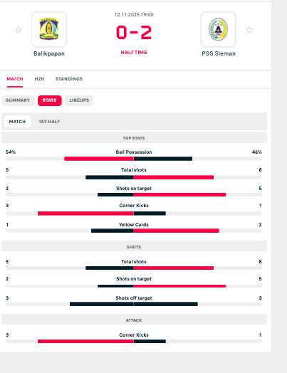 Harianjogja.com, JOGJA—PSS Sleman unggul 2-0 atas Persiba Balikpapan pada babak pertama Championship 2025/2026 di Stadion Batakan, Rabu (12/11/2025) malam. Gol tunggal dicetak Gustavo Tocantins menit ke-33 dan 45+2.