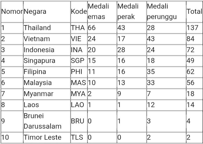 Sementara itu, tuan rumah Thailand semakin kokoh di puncak klasemen perolehan medali. Thailand telah mengumpulkan 66 medali emas, 43 medali perak, dan 28 medali perunggu, sekaligus menjauh dari kejaran para pesaingnya.
