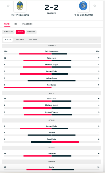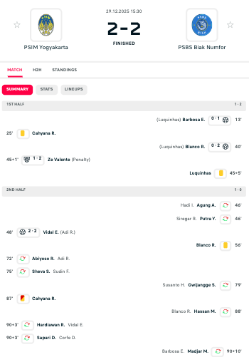 Hasil imbang ini membuat Laskar Mataram tertahan di urutan kelima klasemen sementara dengan koleksi 24 poin. Di sisi lain, PSBS Biak masih berjuang di papan bawah, tepatnya di peringkat ke-15 dengan raihan 13 poin.