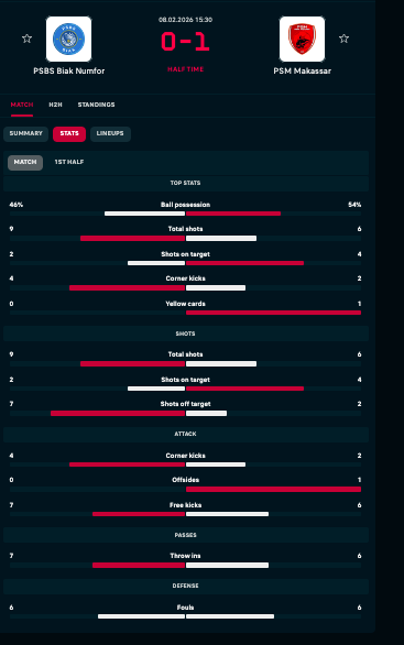 Harianjogja.com, JOGJA — PSM Makassar berhasil menutup babak pertama dengan keunggulan tipis 1-0 atas PSBS Biak pada lanjutan Super League 2025/2026 yang digelar di Stadion Maguwoharjo, Kabupaten Sleman, Daerah Istimewa Yogyakarta (DIY), Minggu (8/2/2026) sore. Gol semata wayang PSM Makassar dicetak oleh Rizky Pratama pada menit ke-43 seusai memanfaatkan umpan Victor Luiz.